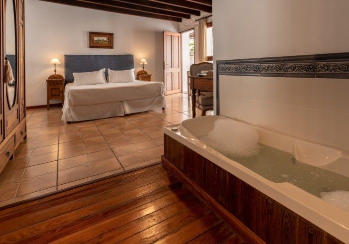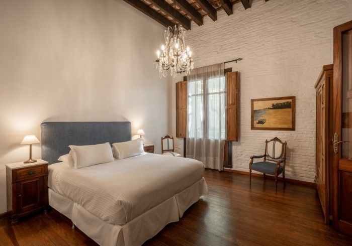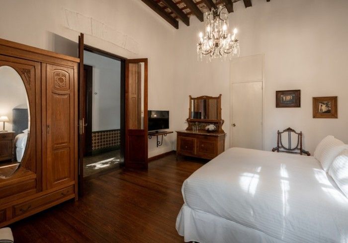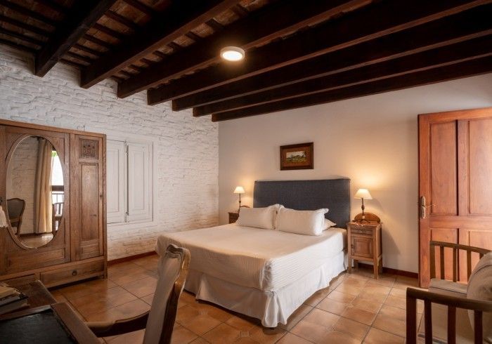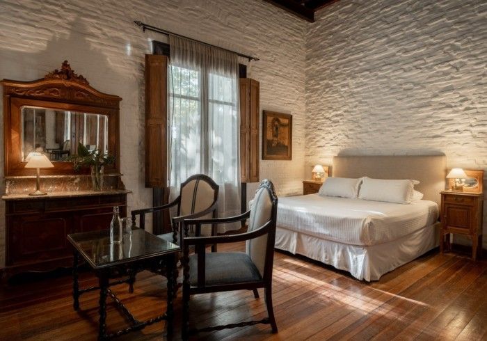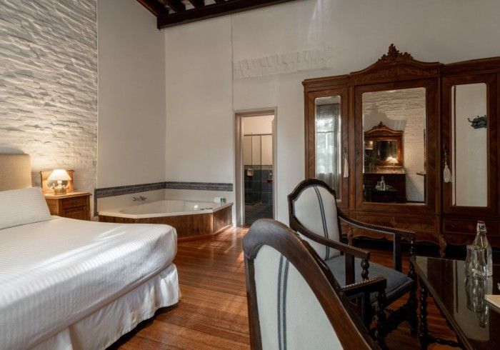 Suite Colonial Deluxe con Jacuzzi. Con su impresionante mobiliario y su arquitectura típica de la casona original, la Suite colonial nos sumerge en el lujo de otra época. Amplia y elegante, equipada con jacuzzi en la habitación, esta suite invita a vivir al máximo la experiencia de una Colonia romántica.