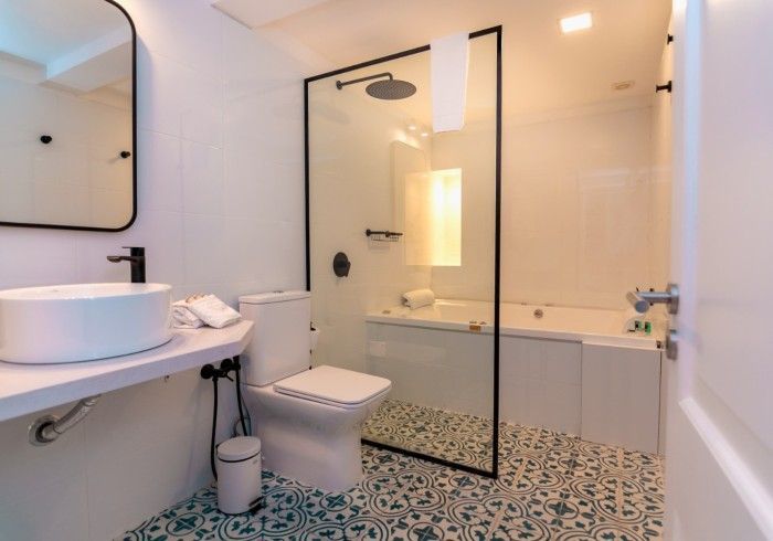 Esta Suite ubicada en planta alta ofrece amplios espacios tanto en el dormitorio como en el baño. Ubicada en segunda planta con ventana hacia los patios internos, se caracteriza por ser muy tranquila para un buen descanso. Delicada y confortable, ideal para descanso en pareja o viajeros solos, esta suite cuenta además con una bañera de hidromasaje para una persona ubicada en la habitación.